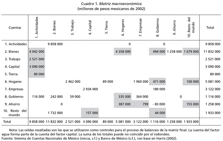 Debido a que la información proveniente del SCNM (INEGIa, s.f) es consistente, los datos desagregados o microeconómicos se ajustaron de tal forma que en el agregado fueran iguales a los totales macroeconómicos10 de dicha fuente. Siguiendo a Harris (2002), las cuentas con mayor detalle en la MCS 2002 microeconómica corresponden a las de actividades y bienes (cada una comprende 21 sectores de la economía nacional); a las de factores productivos (nueve en total); y a las de hogares (seis, según nivel socioeconómico rural y urbano) (anexo 1).