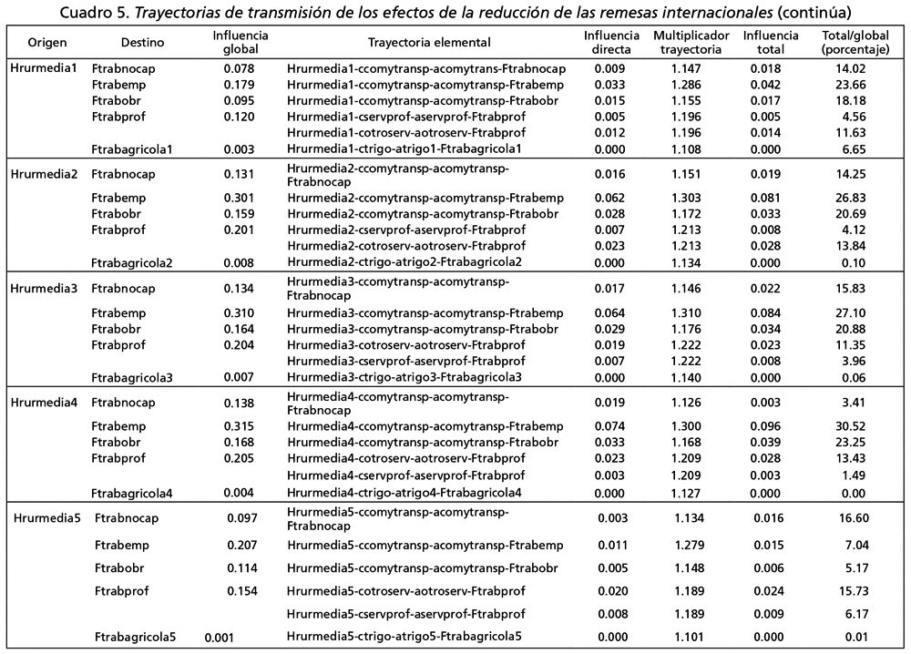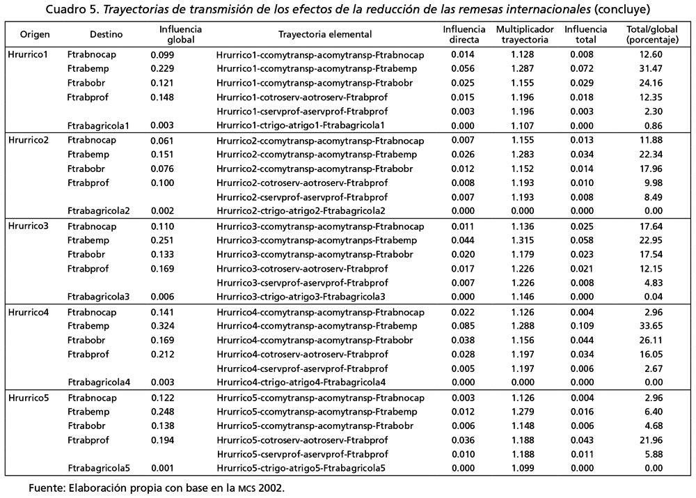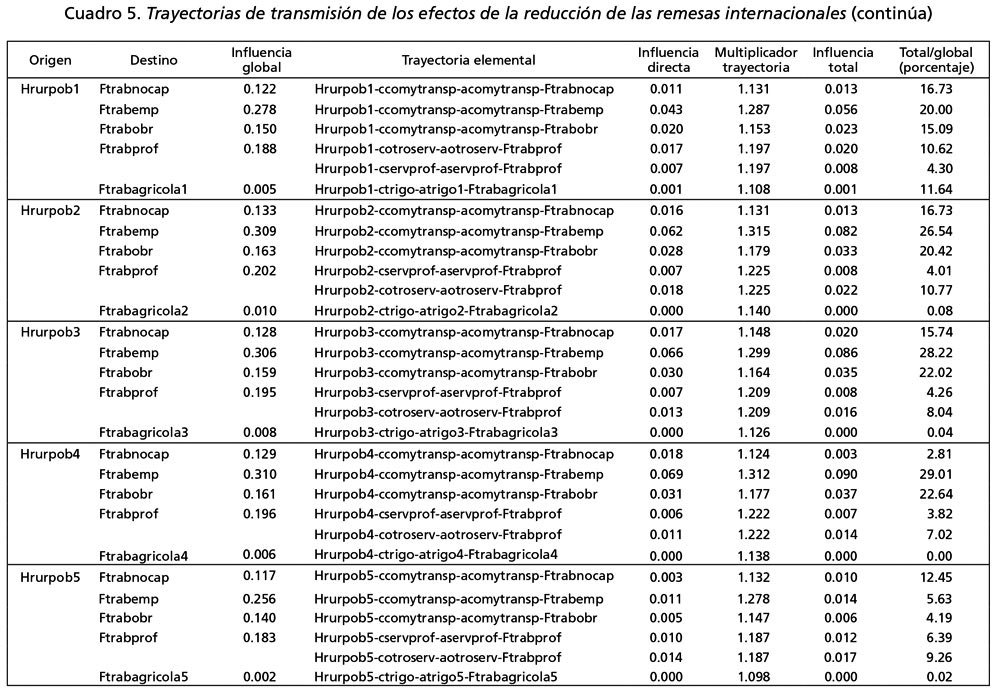 En el cuadro 5 se observa que la disminución de los ingresos de los hogares rurales afecta globalmente en mayor medida al empleo urbano, en especial a las remuneraciones de los empleados y los profesionistas. Esto coincide con los hallazgos de autores como Arroyo y Berumen (2000), Adelman y Taylor (1990) y Taylor et al. (1996).27 Por ejemplo, cada peso menos de remesas a los hogares ricos de la región rural 2 (Centro) disminuye globalmente los ingresos de los empleados urbanos en MXN 0.151 pesos y 22.34% de dicho efecto proviene del sector comercio y transporte.28 A su vez, cada peso de menos en las remesas a los hogares pobres de la región rural 4 (Sureste) disminuye globalmente los ingresos de los empleados urbanos en MXN 0.31 y el sector de comercio y transporte en la región urbana representa 22.34% de dicho efecto. Por otra parte, cada peso restado a las remesas de los hogares ricos de la región rural 2 (Centro) disminuye globalmente los ingresos de los profesionistas urbanos en MXN 0.1 pesos y el sector otros servicios representa 9.98% de dicho efecto, mientras que cada peso menos en las remesas a los hogares de clase media de la región rural 4 (Sureste) disminuye globalmente los ingresos de los profesionistas en MXN 0.205 y el sector otros servicios representa 13.43% de tal efecto. Por otra parte, la influencia global en el empleo rural (trabajo agrícola) es muy reducida, en el rango de MXN 0.001 a MXN 0.010.